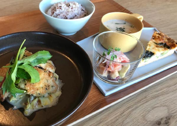 鶏とオレンジのサラダ、菜の花と新タマネギ・ベーコンのキッシュ、